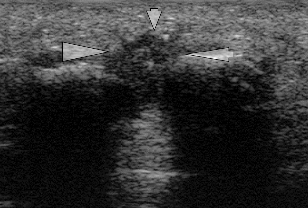 All’esame, che va condotto con scansioni ecotomografiche plantari e dorsali con sonda ad alta frequenza da 7.5 MHz, la masserella appare omogeneamente ipo-ecogenica, ben riconoscibile dal grasso iperecogenico adiacente e l’ombra delle corticali metatarsali.
